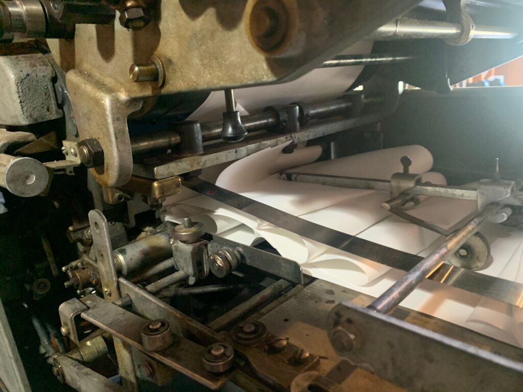 After that my goal was to run some test paper through to make sure it’s feeding through the press properly and smoothly, and BOY was that a mess. The vacuum hoses were pulling in multiple sheets at a time, they kept getting caught on something right away and getting fed in sideways, and then not getting caught by the blanket roller and fed through. The pages that DID go through ended up coming out the receiving end also got caught on something and piled up, very quickly backing up the whole machine. SO. There’s work to be done there as far as adjusting all the rollers that move the paper, and the locations of the guides that keep the paper in line from end to end.