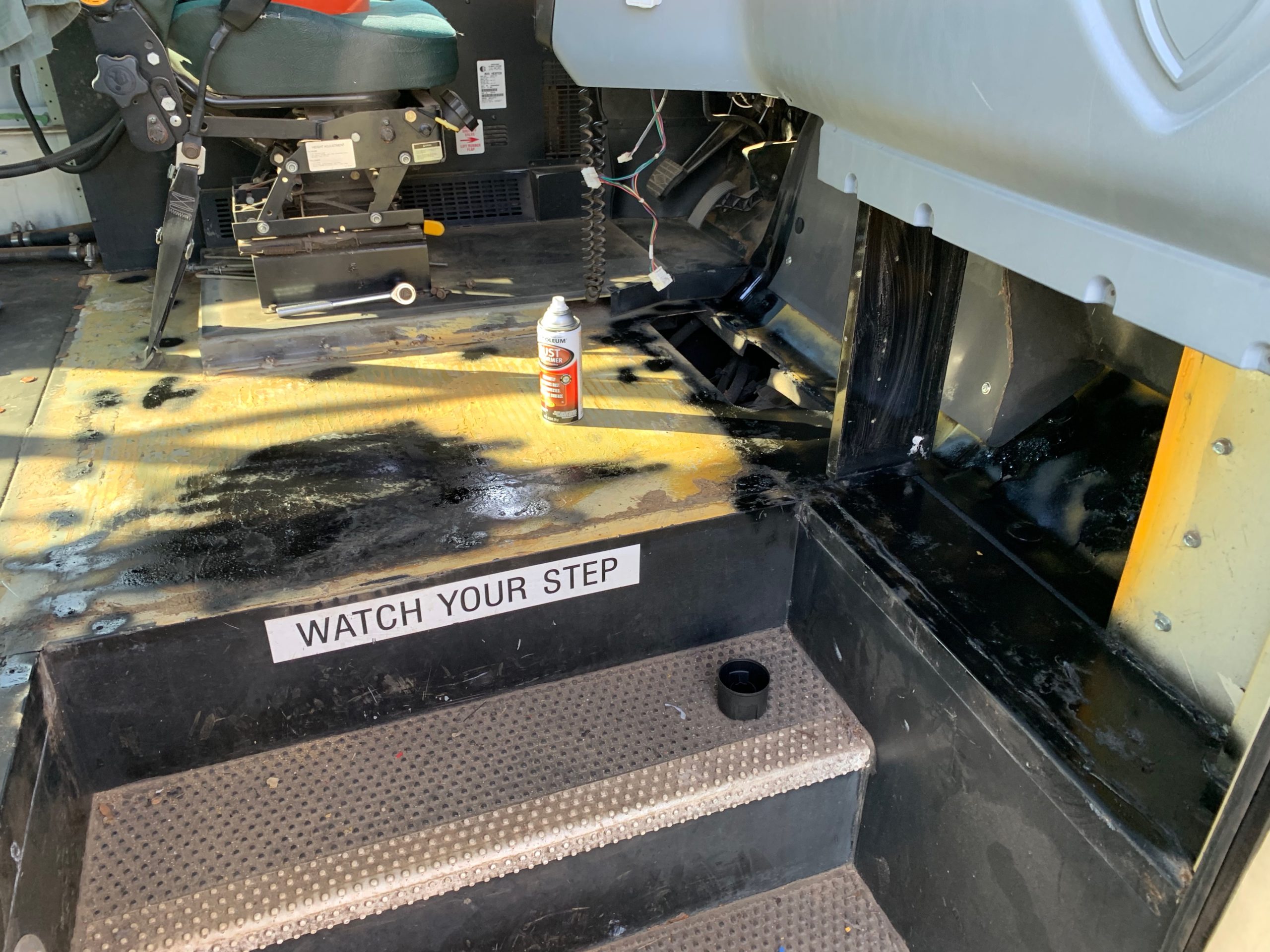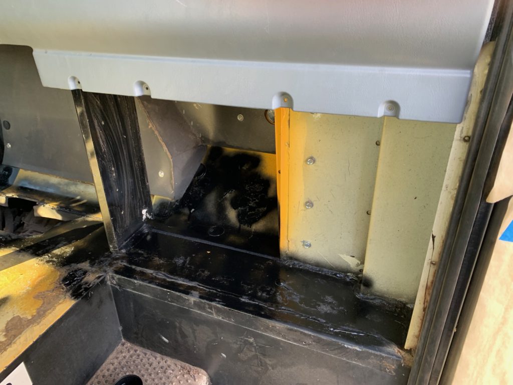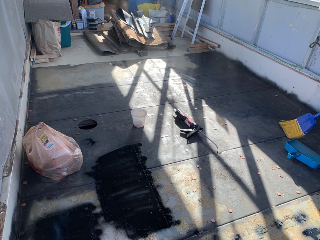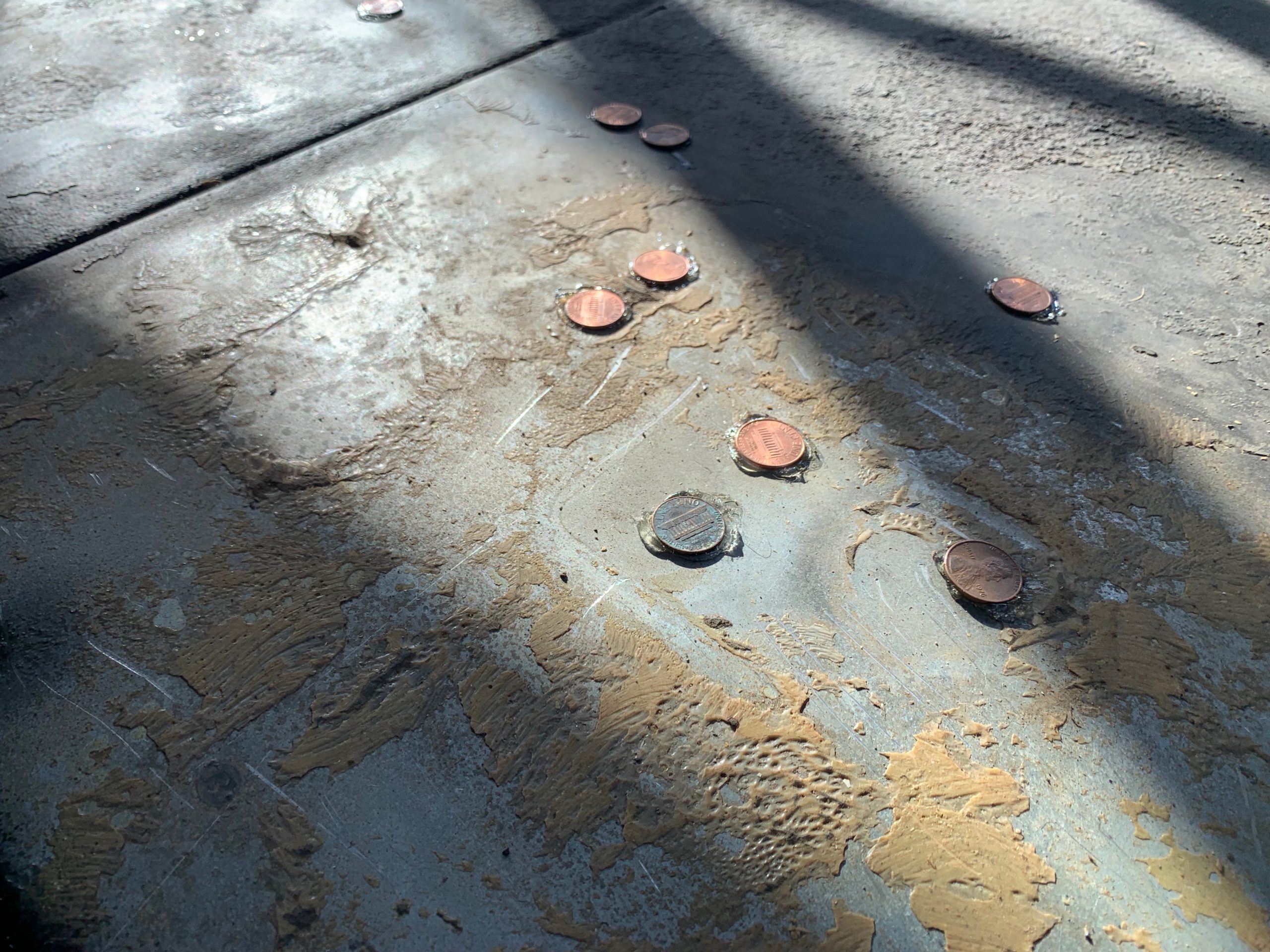 Read more: Housebus Progress: Feb 1, 2023After grinding out all the rust on Section C of the floor the other day, I went back out today to glue pennies down to seal up all the holes leftover from the seats and the metal trim down the center aisle. First though I decided that, since I’m already working at the front end of the bus, it didn’t make any sense to not also do the subfloor for the cab/mudroom. So, I finished pulling all the rubber and metal panels off of that area, and the little angled metal faces of the driver’s seat platform. The new floor is going to come up close to the same level of the platform, and this is easier than trying to build around it. Besides, it was held on with little plastic screws, so it was hardly structural.