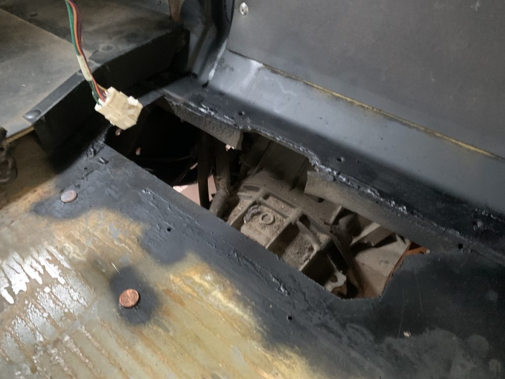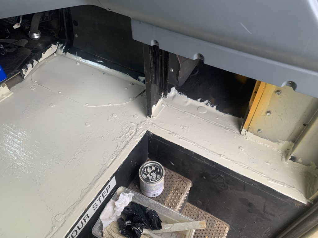 First off, I ran out to Home Depot again to pick up another quart of the Rustoleum protective enamel AGAIN. No big deal. Got back to the bus, and the first thing I had to do was reinstall this wild metal plate that was apparently covering up a big hole to access part of the transmission under the cab floor? What? When I pulled it up it was glued down with seam sealer just like the windows, so I made sure to apply a good thick bead of butyl tape around the edge before I bolted it back down.