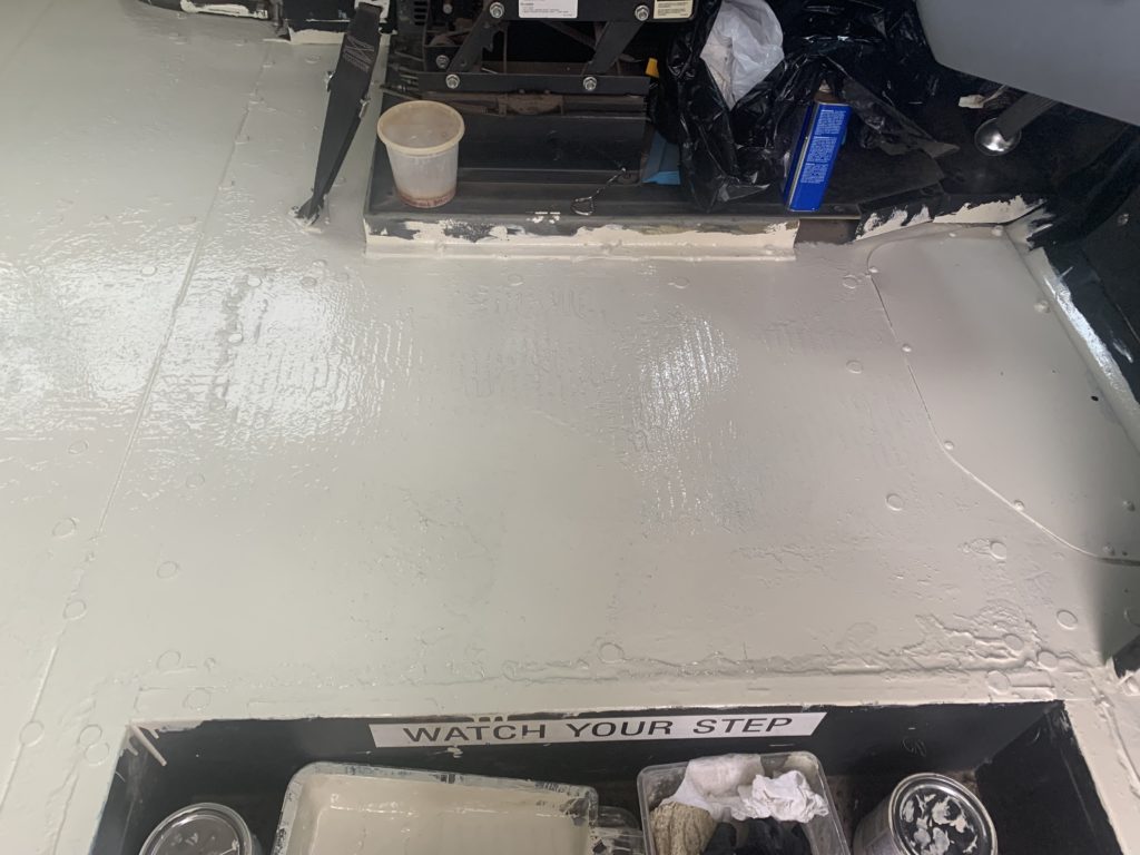This was a much larger section of floor than I’d previously tackled in a single sitting, so I might have misunderestimated* how much paint I’d need to finish it up. Plus my roller has a much thicker nap than I think I really needed, so it tends to soak up a LOT of extra paint as well. Anyhow, I followed the same procedure I’d used for previous sections, using a brush to start along all the edges and pushing paint down into the seams between the metal floor panels, anywhere the roller wouldn’t easily go. Then I start pouring small amounts of paint into the tray and rolling it down. It’s crazy how fast painting goes once you’re actually doing it, especially with a good wide roller.