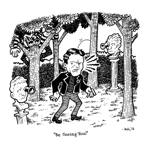 #IF: Surveillance by indigo on June 26, 2013 and modified on March 18, 2021. Posted In: Blog, Fan Art & Sketchcards, Illustration Friday, Illustrations “Be Seeing You!” 2013, 6×6″ pen & ink on bristol. Self-promotional