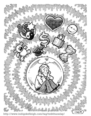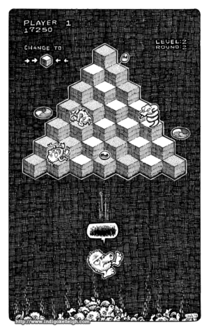 Q*bert regrets his decision almost as soon as he has made it. 11 x 8.5″, pen & ink on bristol Self-promotional.